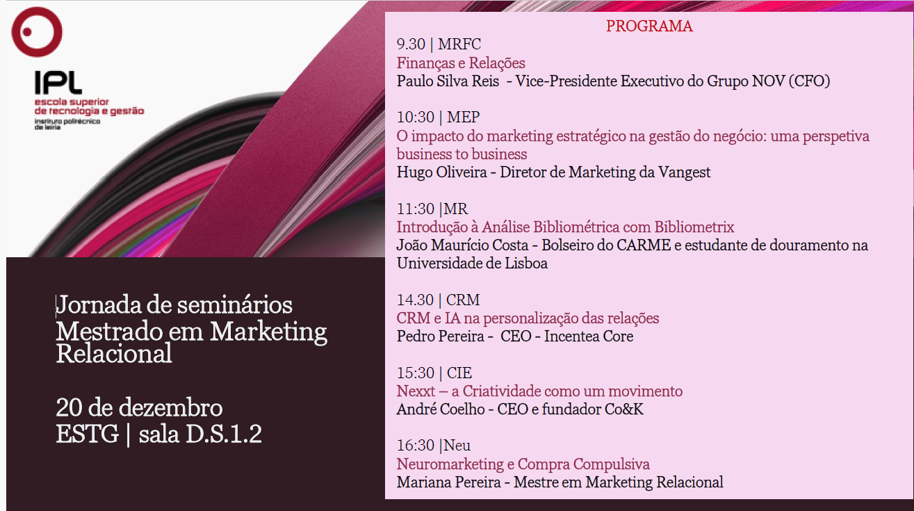 Aula Aberta (20/12/2025) Título do evento: Jornada de seminários – Mestrado em Marketing Relacional Oradores: Ver cartaz Resumo da comunicação: ver cartaz Horário de realização da comunicação: 09h30-17h30 – D.S.1.2 Organizadores do evento: Mestrado em Marketing Relacional