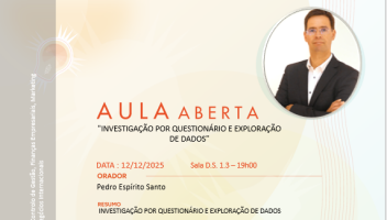 Aula Aberta (12/12/2025) Título do evento: “Investigação por Questionário e Exploração de Dados” Orador: Pedro Espirito Santo Resumo da comunicação: ver cartaz Horário de realização da comunicação: 19h00 – D.S. 1.3 Organizadores do evento: Mestrado em Controlo de Gestão, Finanças Empresariais, Marketing Relacional e Negócios Internacionais