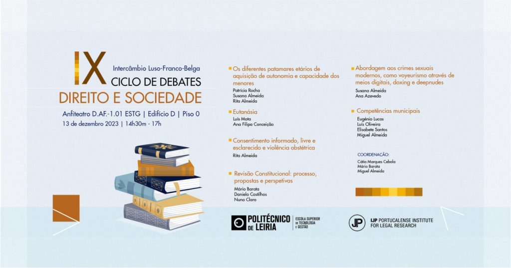 Realiza-se, dia 13 de dezembro, no anfiteatro -1.01, do Edifício D, o IX Ciclo de Debates – Direito e Sociedade. O IX Ciclo de Debates – Direito e Sociedade irá apresentar seis temas no âmbito jurídico e da Administração Pública: Consentimento informado, livre e esclarecido e violência obstétrica; Eutanásia; Os diferentes patamares etários de aquisição de autonomia e capacidade dos menores; Processo de Revisão Constitucional; Abordagem aos crimes sexuais modernos, como voyeurismo através de meios digitais, doxing e deepnudes; e Competências Municipais. A iniciativa integra o IX Exchange Programme for students of Paralegal Studies, Law for Solicitors, and Public Administration, que tem realização prevista, de 18 e 20 de março 2024, na cidade de Bruges, na Bélgica.