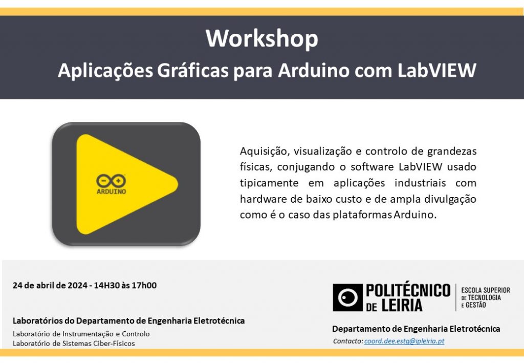 Realiza-se, dia 24 de abril, o Workshop intitulado: “Aplicações Gráficas para Arduino com LabVIEW”. A inscrição é gratuita, carecendo, no entanto, de inscrição prévia através do link: https://forms.office.com/e/BR28yMSJvu.
