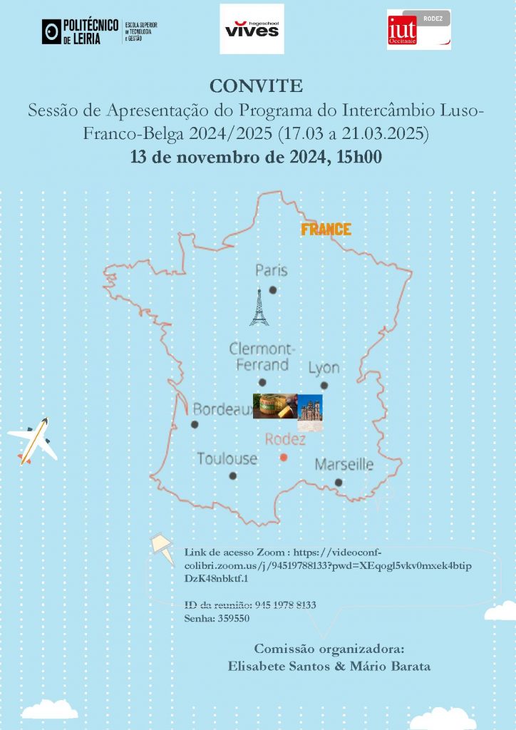 Realiza-se, dia 13 de novembro, pelas 15h00, a Sessão de Apresentação do Programa de Intercâmbio Luso-Franco-Belga 2024/2025, que terá lugar entre os dias 17 a 21 de março de 2025, no Instituto Universitário de Rodez, em França. A iniciativa é do Departamento de Ciências Jurídicas da ESTG.
