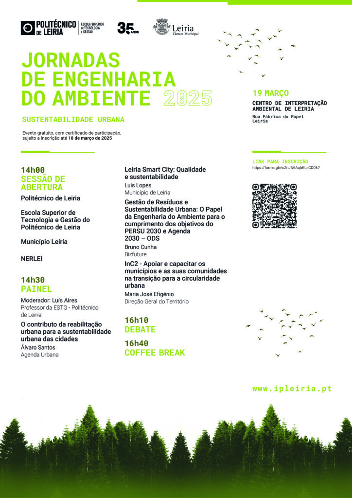 Partilhar ideias e soluções para mitigar os impactes ambientais e melhorar a qualidade de vida nas cidades, promovendo comunidades mais resilientes, inclusivas e eficientes na gestão de recursos, é o objetivo da edição de 2025 das Jornadas de Engenharia do Ambiente (JEA2025), promovidas pela ESTG, em colaboração com a Câmara Municipal de Leiria. Subordinado ao tema ‘Sustentabilidade Urbana’, o evento decorre no dia 19 de março, pelas 14h00, no Centro de Interpretação Ambiental de Leiria.