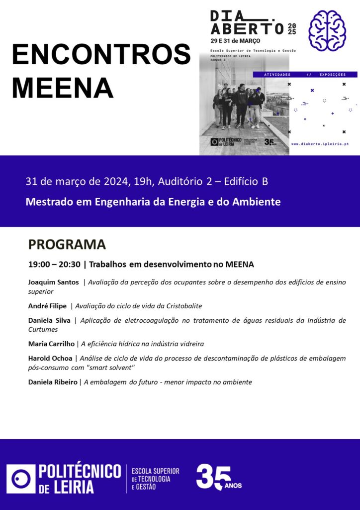 Realiza-se, dia 31 de março, no auditório 2 da ESTG, o Encontros MEENA . A iniciativa é da coordenação de Curso de Mestrado em Engenharia da Energia e do Ambiente, e tem como principal objetivo reunir os estudantes do curso, em particular os que se encontram a desenvolver os seus trabalhos de Mestrado, proporcionando-lhe a possibilidade de apresentação dos trabalhos em desenvolvimento e troca de experiências.