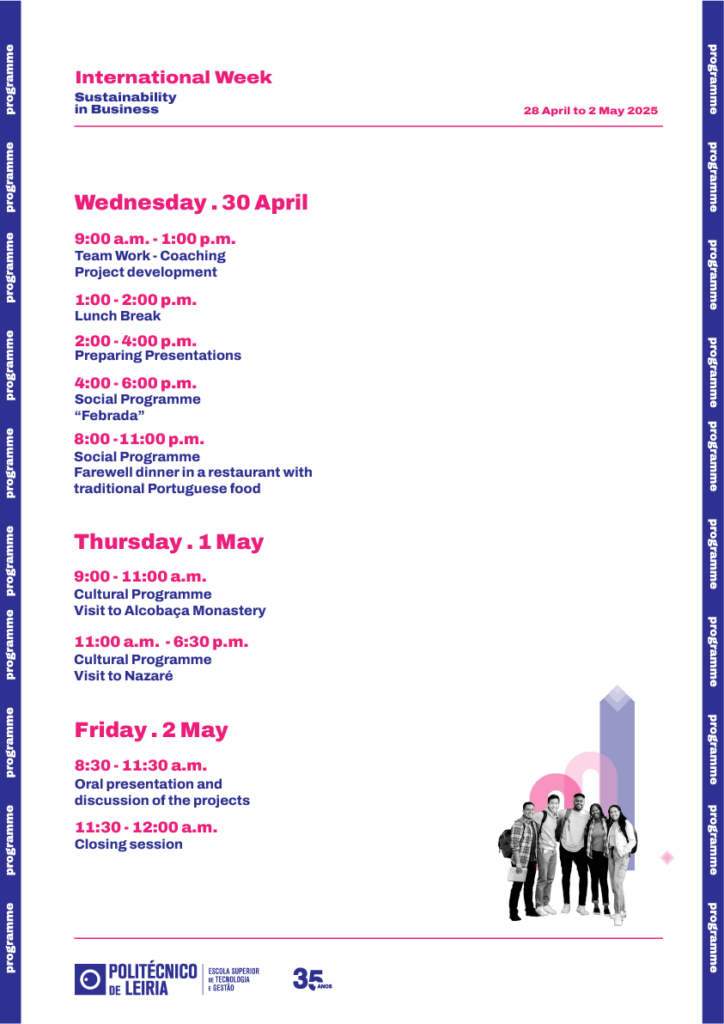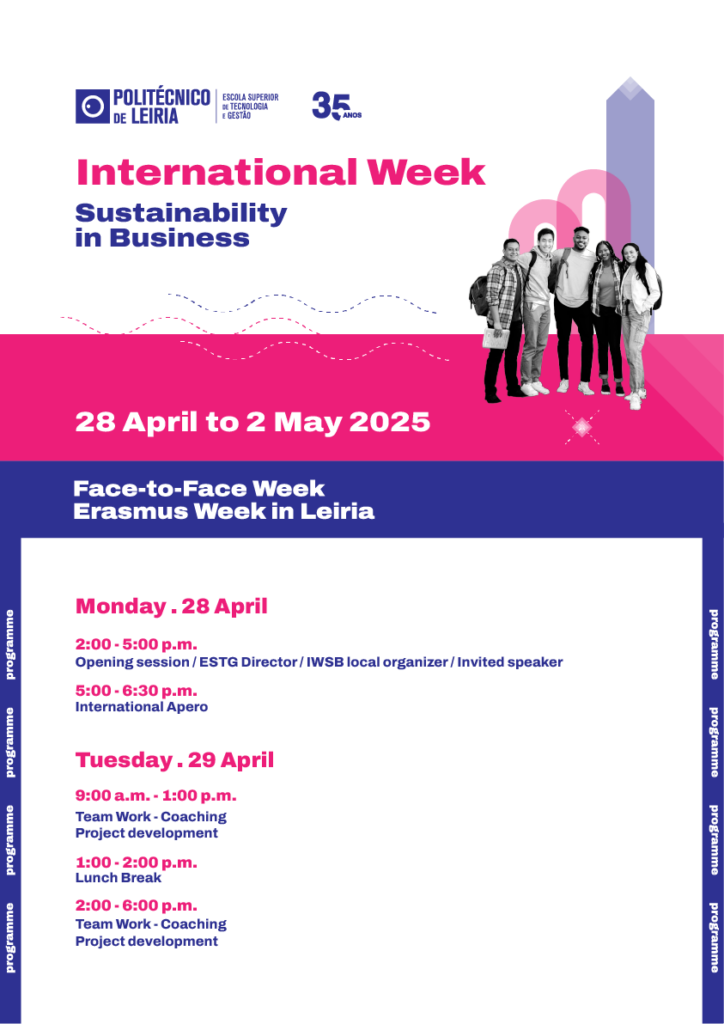 De 28 de abril a 2 de maio irá decorrer na ESTG a componente presencial da International Week (IW) Sustainability in Business, organizada pelo Departamento de Gestão e Economia. Além de 35 estudantes da licenciatura em Contabilidade e Finanças e da licenciatura em Gestão, do Politécnico de Leiria, participam na IW 36 estudantes de 3 universidades europeias e 5 professores (Vives University of Applied Sciences, Tampere University of Applied Sciences e Rodez University Institute of Technology).