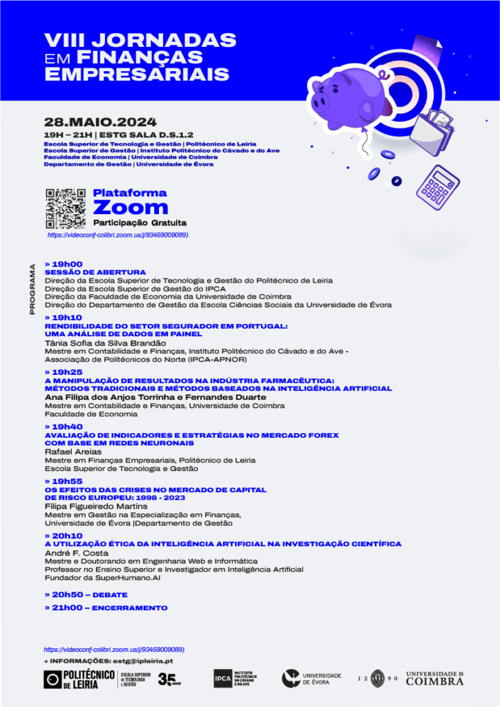 Realizam-se amanhã, dia 28 de maio, em formato online, as VIII Jornadas em Finanças Empresariais. A organização das VIII Jornadas é realizada conjuntamente entre o Mestrado em Finanças Empresariais do Politécnico de Leiria, o Mestrado em Contabilidade e Fiscalidade da APNOR (Instituto Politécnico do Cávado e Ave), o Mestrado em Gestão, especialização em Finanças, da Universidade de Évora, e o Mestrado em Contabilidade e Fiscalidade da Universidade de Coimbra.