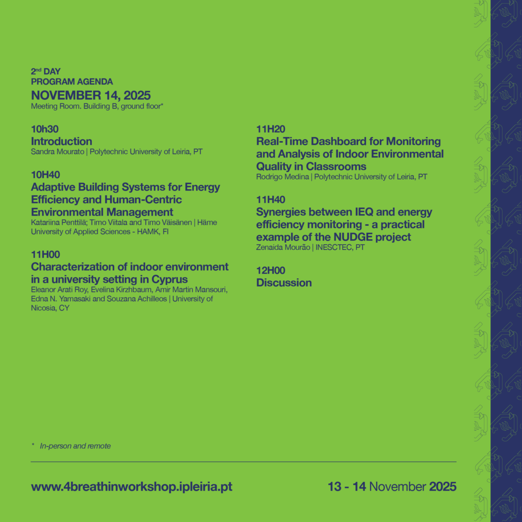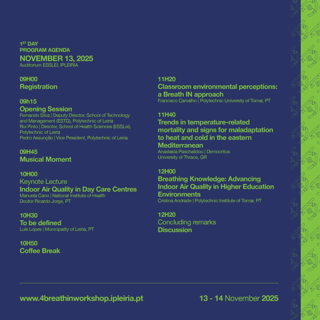 O 4.º Workshop Internacional Indoor Environmental Quality in Support of Wellbeing and Sustainability, organizado no âmbito do projeto Breath In Erasmus+, decorrerá nos dias 13 e 14 de novembro, em Leiria.