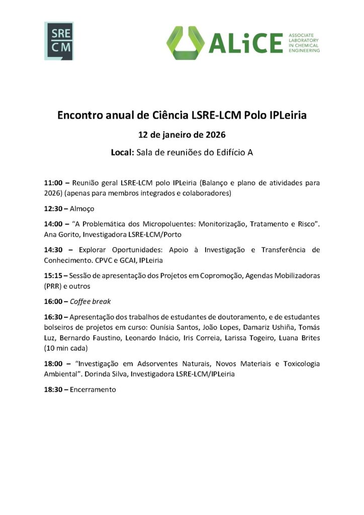 No âmbito das atividades realizadas na UI LSRE-LCM polo IPleiria, realiza-se, dia 12 de janeiro, na sala de reuniões do Edifício A, o Encontro de Ciência LSRE-LCM.