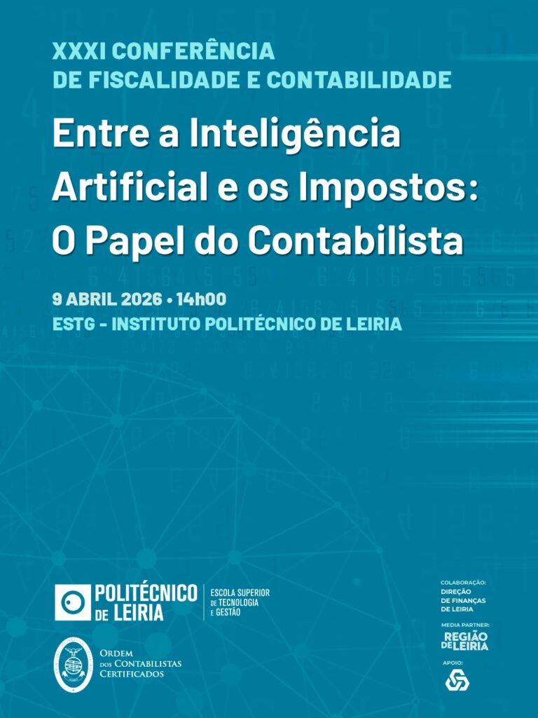 O Departamento de Gestão e Economia da ESTG e a Ordem dos Contabilistas Certificados (OCC) organizam, dia 9 de abril, a 𝐗𝐗𝐗𝐈 𝐂𝐨𝐧𝐟𝐞𝐫𝐞̂𝐧𝐜𝐢𝐚 𝐝𝐞 𝐅𝐢𝐬𝐜𝐚𝐥𝐢𝐝𝐚𝐝𝐞 𝐞 𝐂𝐨𝐧𝐭𝐚𝐛𝐢𝐥𝐢𝐝𝐚𝐝𝐞, tendo como tema: 𝐄𝐧𝐭𝐫𝐞 𝐚 𝐢𝐧𝐭𝐞𝐥𝐢𝐠𝐞̂𝐧𝐜𝐢𝐚 𝐚𝐫𝐭𝐢𝐟𝐢𝐜𝐢𝐚𝐥 𝐞 𝐨𝐬 𝐢𝐦𝐩𝐨𝐬𝐭𝐨𝐬: 𝐨 𝐩𝐚𝐩𝐞𝐥 𝐝𝐨 𝐜𝐨𝐧𝐭𝐚𝐛𝐢𝐥𝐢𝐬𝐭𝐚». O evento terá lugar, a partir das 14h00, no Auditório 1, do Edifício B.