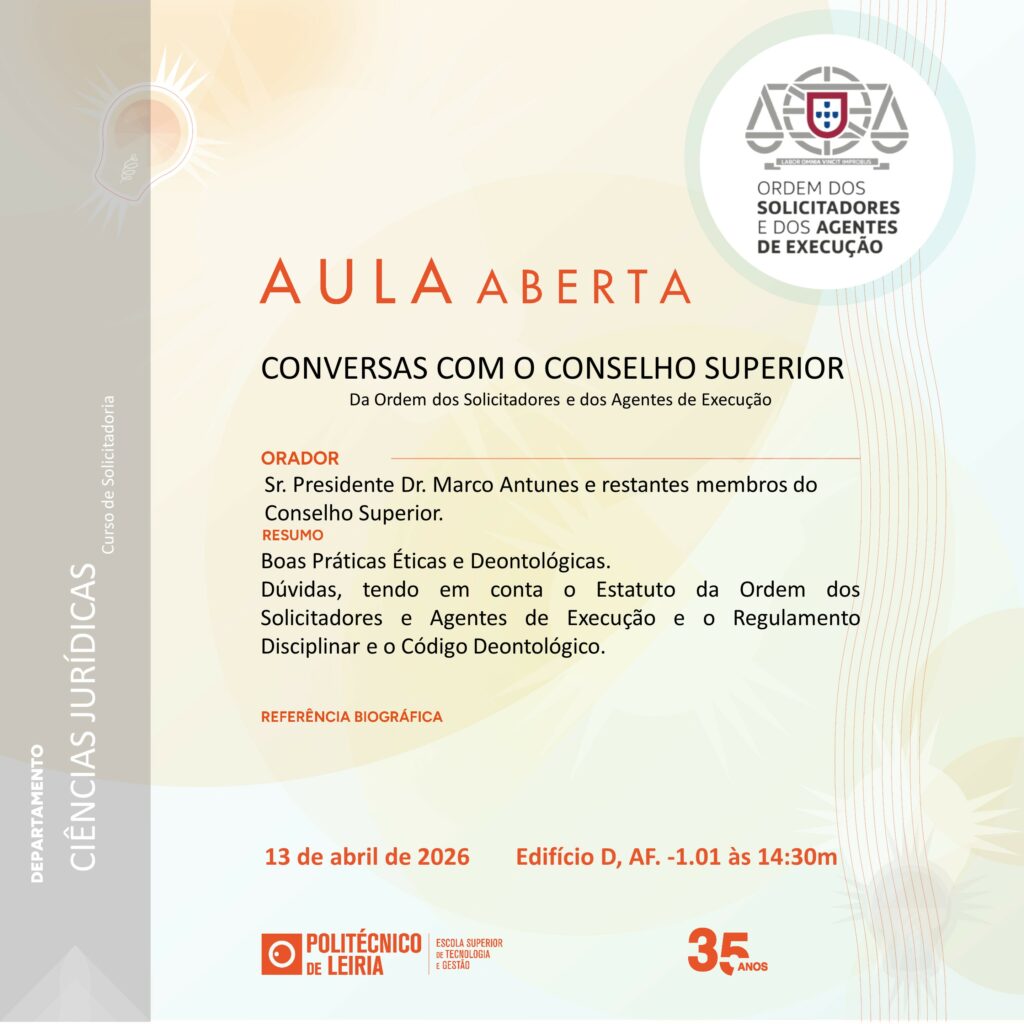 No âmbito da unidade curricular de Deontologia, do curso de Solicitadoria, realiza-se, dia 13 de abril, a Aula Aberta subordinada Conversas com o Conselho Superior. Terá como orador convidado o Presidente do Conselho Superior da Ordem dos Solicitadores e dos Agentes de Execução, Marco Antunes.