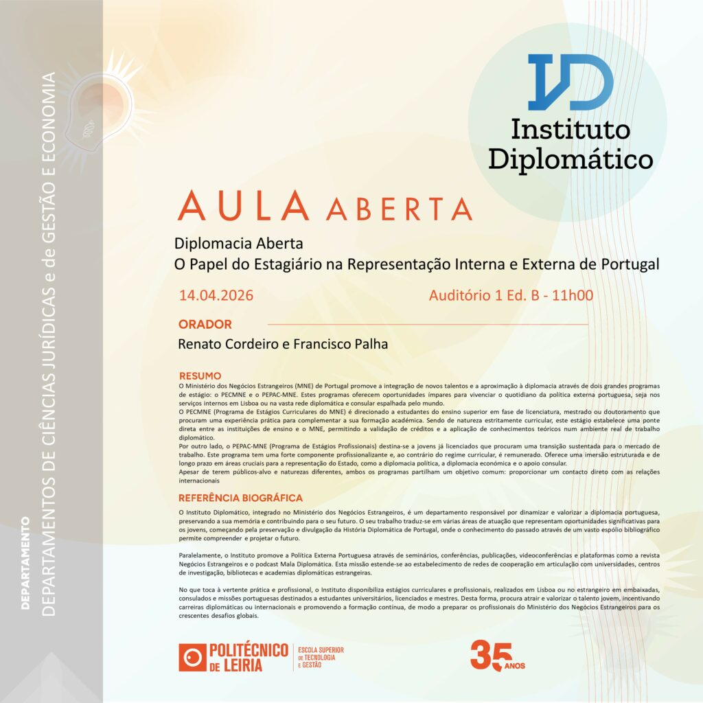Realiza-se, dia 14 de abril, no auditório 1, do Edifício B, uma aula aberta dedicada aos estágios curriculares e profissionais promovidos pelo Ministério dos Negócios Estrangeiros. A sessão terá lugar pelas 11h, e contará com a apresentação sobre os estágios curriculares e estágios profissionais, seguindo-se o testemunho de estagiários inseridos naqueles programas.