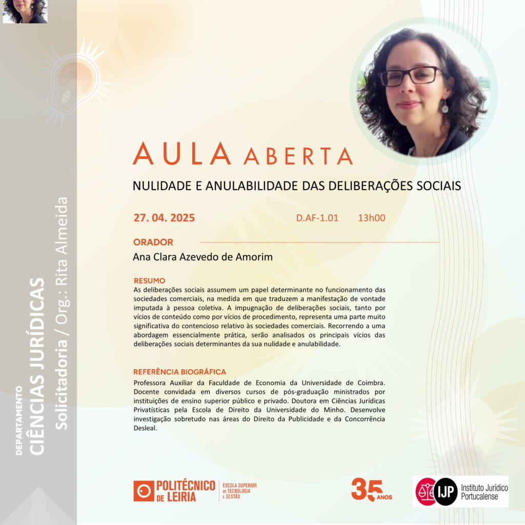 No âmbito do curso de Solicitadoria, realiza-se, dia 27 de abril, a Aula Aberta: 𝐍𝐮𝐥𝐢𝐝𝐚𝐝𝐞 𝐞 𝐚𝐧𝐮𝐚𝐛𝐢𝐥𝐢𝐝𝐚𝐝𝐞 𝐝𝐚𝐬 𝐝𝐞𝐥𝐢𝐛𝐞𝐫𝐚𝐜̧𝐨̃𝐞𝐬 𝐬𝐨𝐜𝐢𝐚𝐢𝐬. Terá como oradora Ana Clara Azevedo de Amorim.