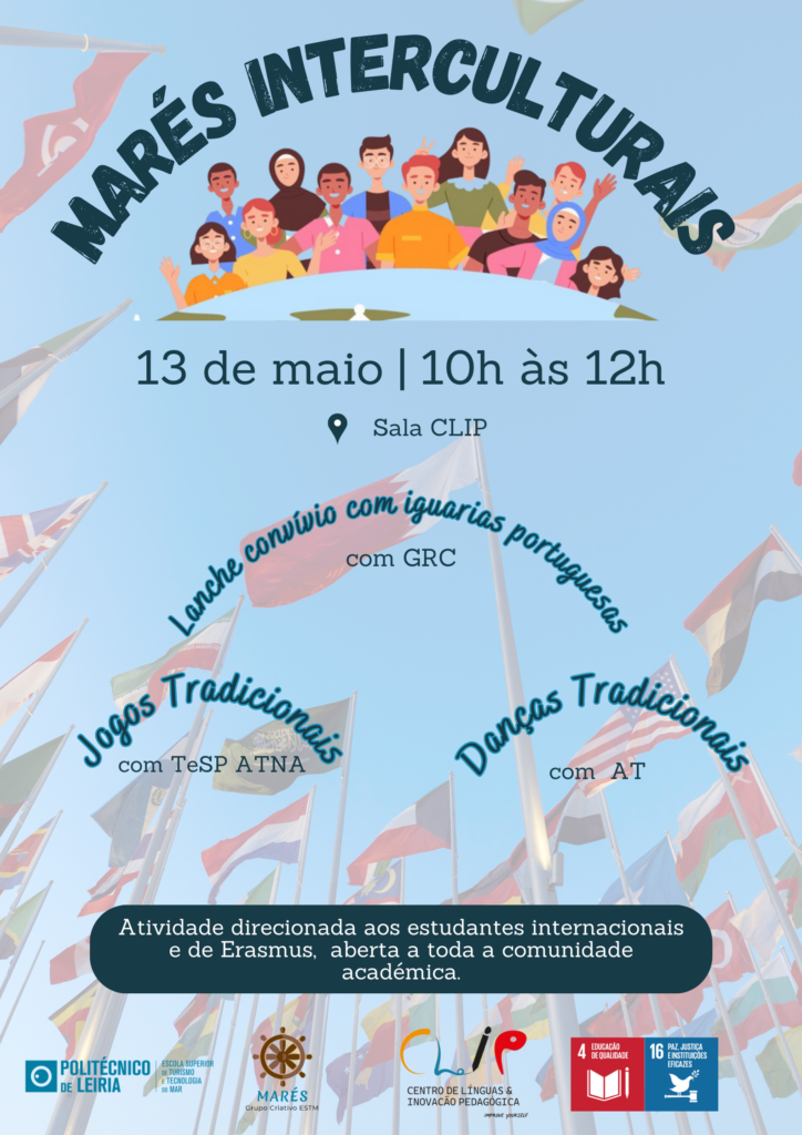 No dia 13 de maio, entre as 10h00 e as 12h00, terá lugar a 2.ª edição do Marés Interculturais, uma iniciativa do grupo Marés ESTM que promove o encontro entre culturas e dá a conhecer a cultura portuguesa aos estudantes internacionais e de mobilidade Erasmus da nossa escola.