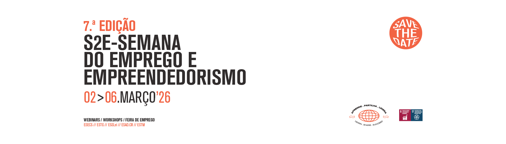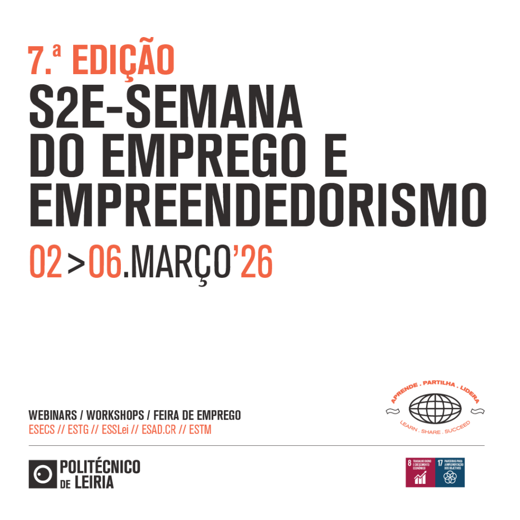 Se és estudante ou diplomado do Politécnico de Leiria, a 7.ª edição da S2E – Semana de Empregabilidade e Empreendedorismo é uma oportunidade que não vais querer perder. Ao longo de vários dias, esta iniciativa foi pensada para te apoiar na transição para o mercado de trabalho e para te ajudar a estruturar, de forma estratégica, o teu próximo passo profissional.