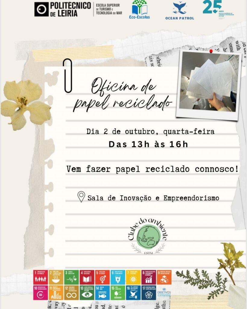 No dia 2 de outubro, quarta-feira, o Clube do Ambiente da ESTM promove a Oficina de Papel Reciclado! Esta atividade, a realizar-se na Sala de Inovação e Empreendedorismo, será uma excelente oportunidade para aprender técnicas de reciclagem de papel e contribuir para um ambiente mais sustentável.