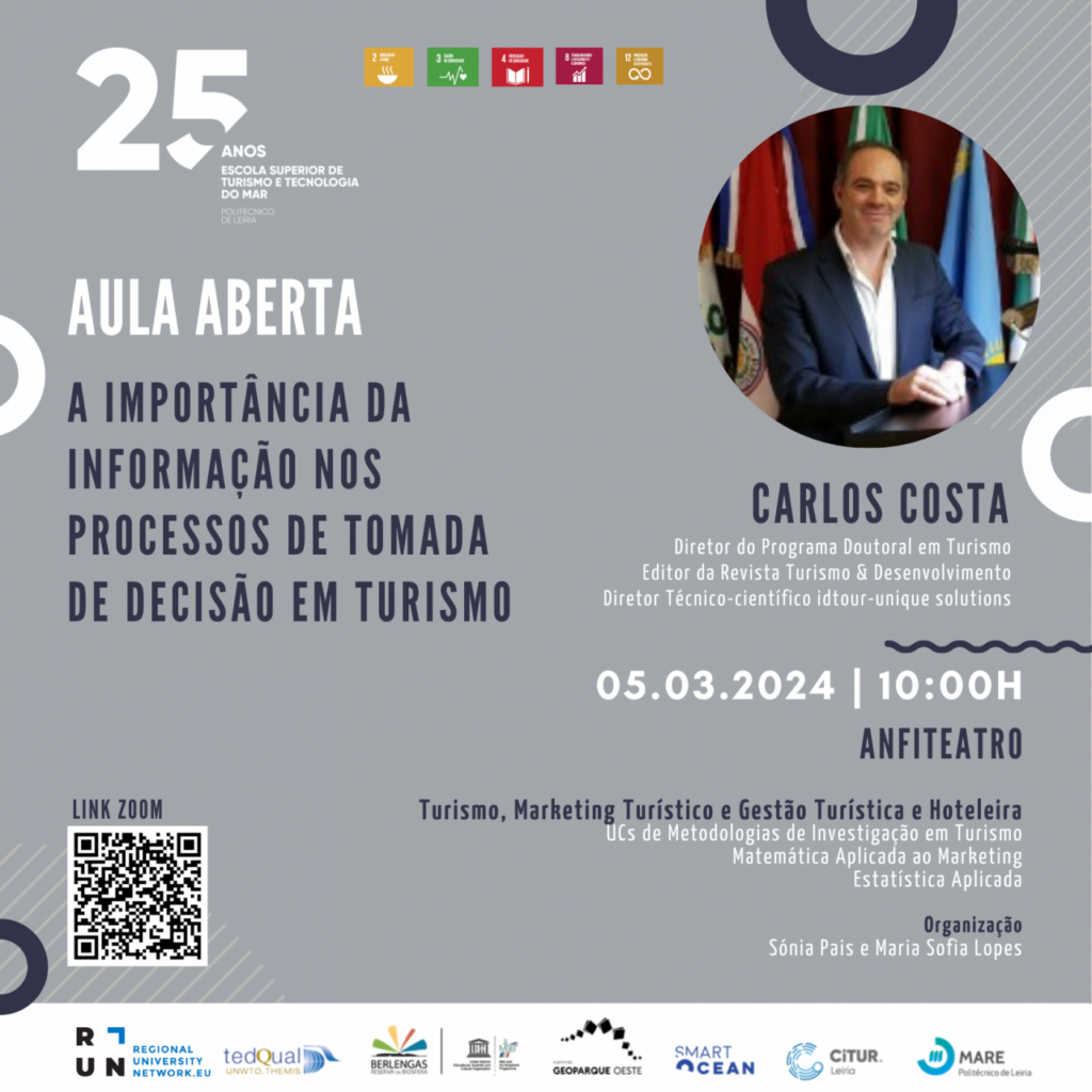 No dia 05 de março será transmitida uma aula aberta via zoom, no auditório da ESTM, com Carlos Costa, subordinada ao tema “A importância da informação nos processos de tomada de decisão em turismo”.