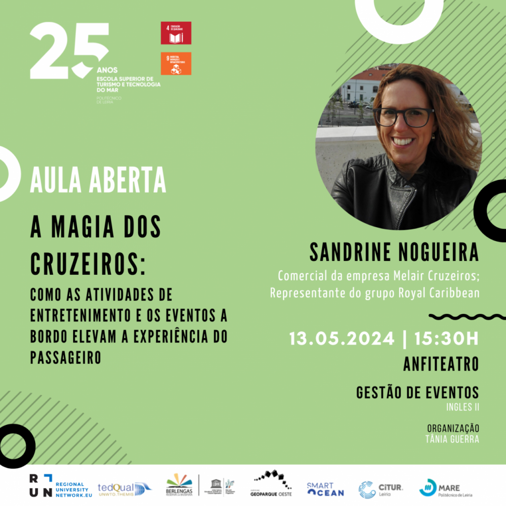 No dia 13 de maio, às 15:30 horas, tem lugar no Anfiteatro uma aula aberta subordinada ao tema “A Magia dos Cruzeiros: Como as atividades de entretenimento e os eventos a bordo elevam a experiência do passageiro”, com Sandrine Nogueira, Comercial da empresa Melair Cruzeiros e Representante do grupo Royal Caribbean.