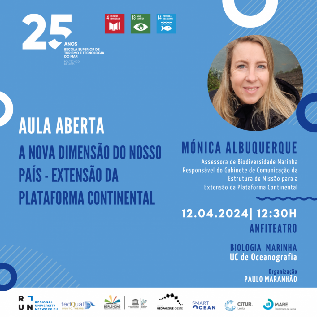 No dia 12 de abril, tem lugar uma Aula Aberta no Anfiteatro da ESTM, com Mónica Albuquerque, Assessora de Biodiversidade Marinha e Responsável do Gabinete de Comunicação da Estrutura de Missão para a Extensão da Plataforma Continental. subordinada ao tema “A nova dimensão do nosso País – Extensão da Plataforma Continental”.