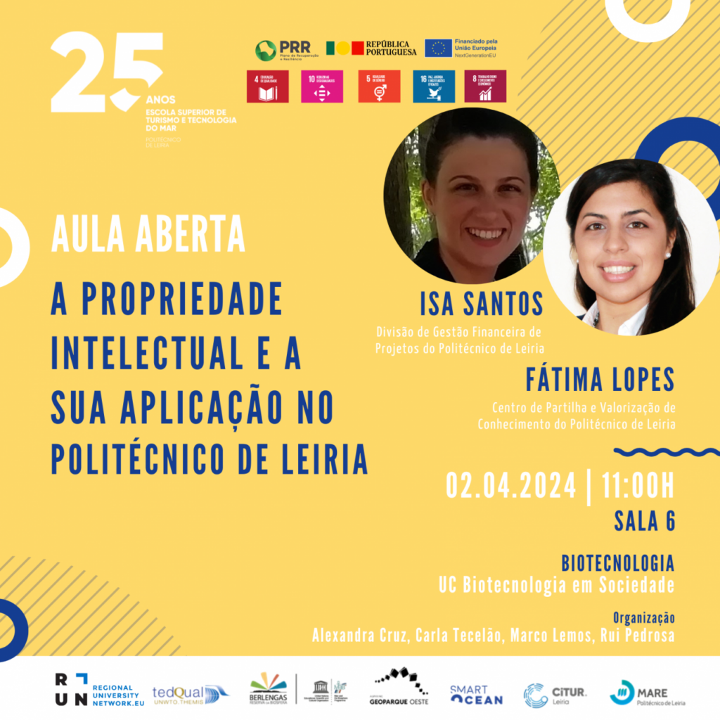 No dia 02 de abril, tem lugar uma aula aberta com Isa Santos, da Divisão de Gestão Financeira de Projetos do Politécnico de Leiria, e Fátima Lopes, do Centro de Partilha e Valorização de Conhecimento do Politécnico de Leiria, com o tema Comunicar Ciência – A propriedade intelectual e a sua aplicação no Politécnico de Leiria.