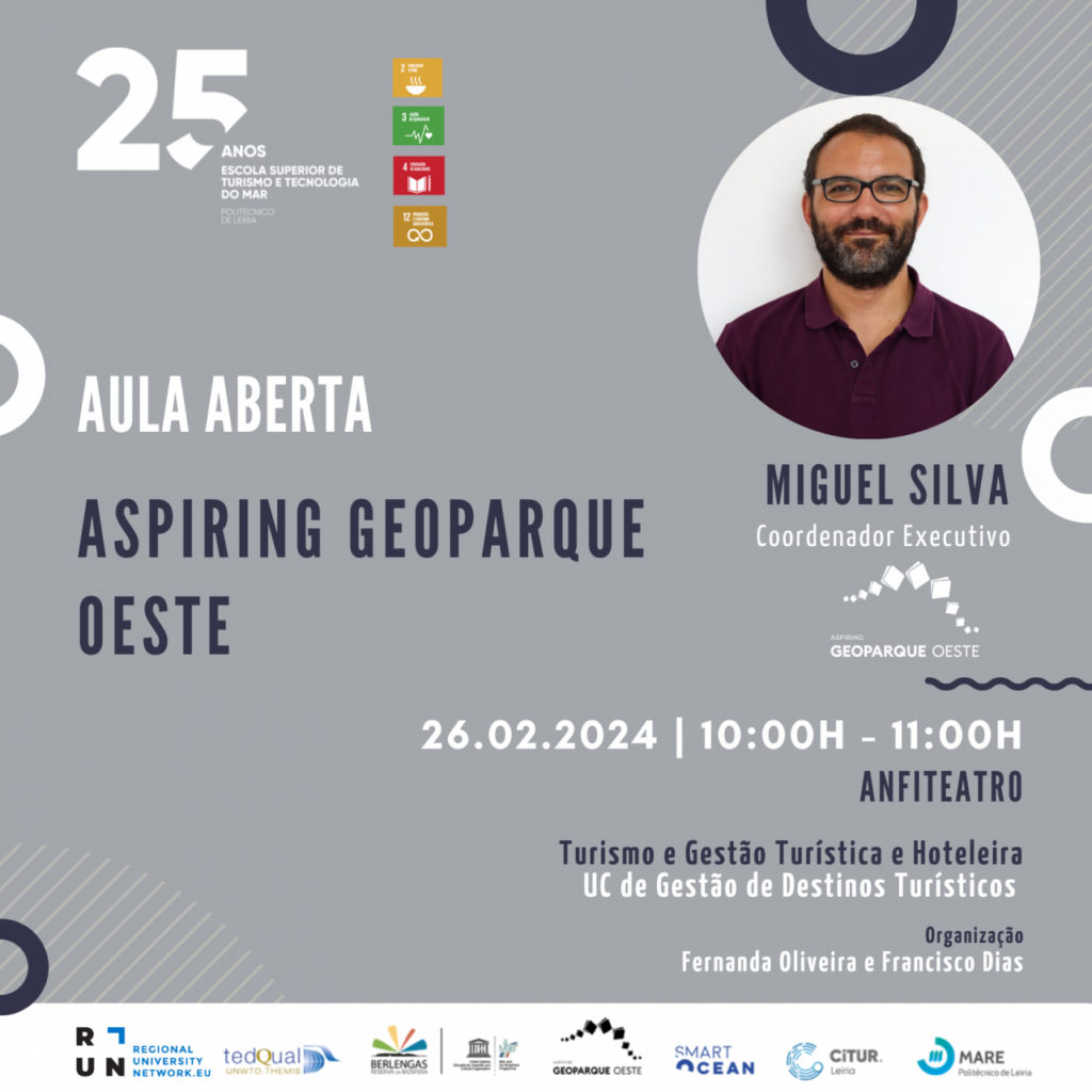 No dia 26 de fevereiro, das 10:00 horas às 11:00 horas, tem lugar uma aula aberta, no Anfiteatro da ESTM, com Miguel Reis, Coordenador Executivo do Aspiring Geoparque Oeste, numa palestra sobre o Geoparque, relacionado com a governança e cooperação na gestão de destinos turísticos, a promoção de marcas territoriais e a valorização do património (em particular territórios de baixa densidade).