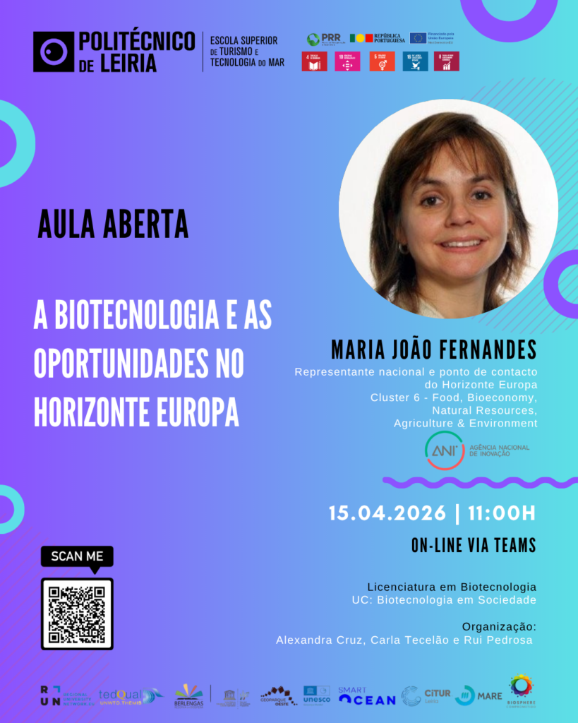 Esta aula aberta integra a Unidade Curricular de Biotecnologia em Sociedade, da Licenciatura em Biotecnologia, e pretende dar a conhecer o enquadramento estratégico do programa Horizonte Europa, bem como incentivar os estudantes a explorar caminhos de investigação, inovação e internacionalização.