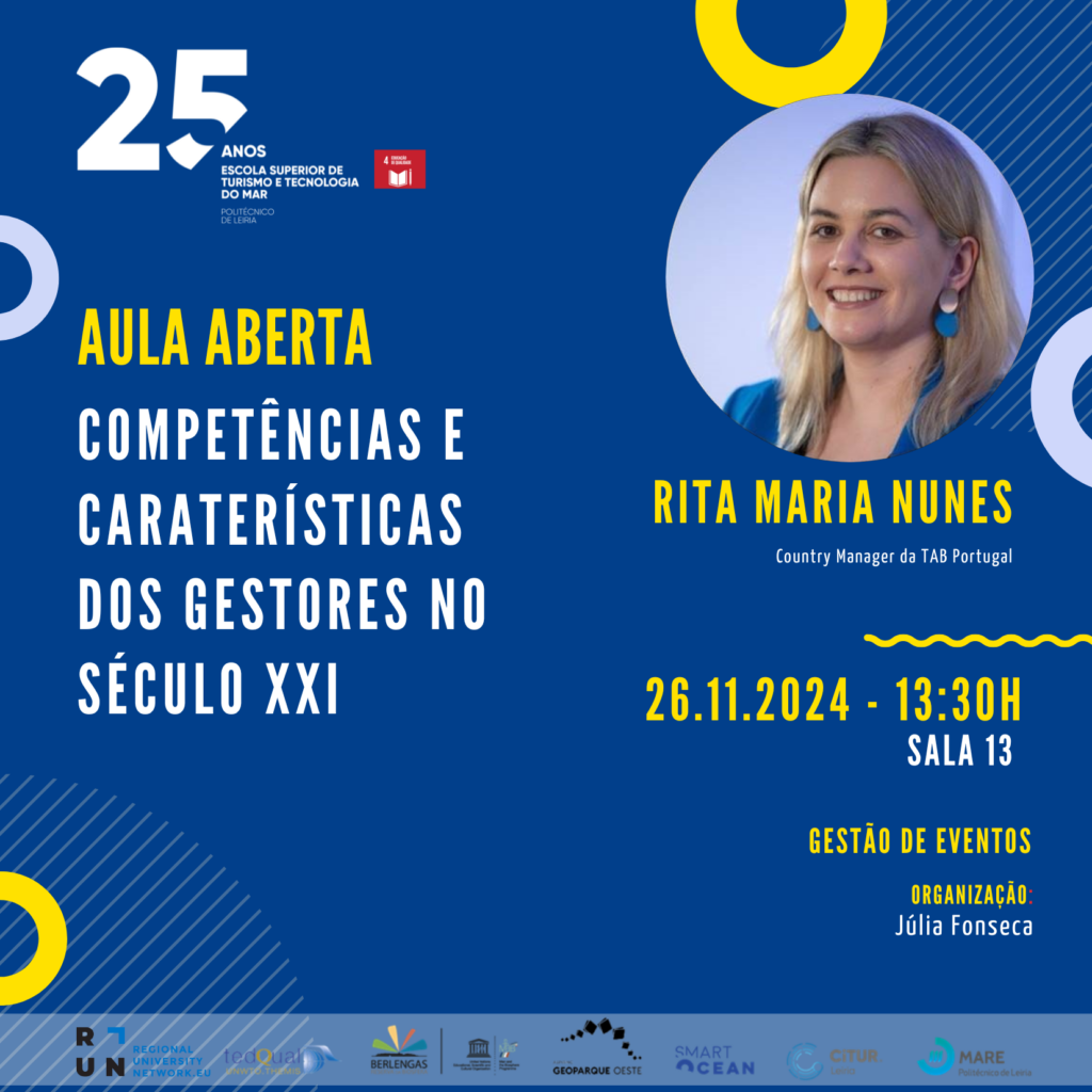 No dia 26 de novembro, às 13h30, a ESTM acolhe a aula aberta “Competências e Características dos Gestores no Século XXI”, com Rita Maria Nunes, Country Manager da TAB Portugal. Este evento, organizado pela docente Júlia Fonseca no âmbito da Licenciatura em Gestão de Eventos, decorre na Sala 13 e irá explorar as exigências e desafios da liderança no panorama atual.