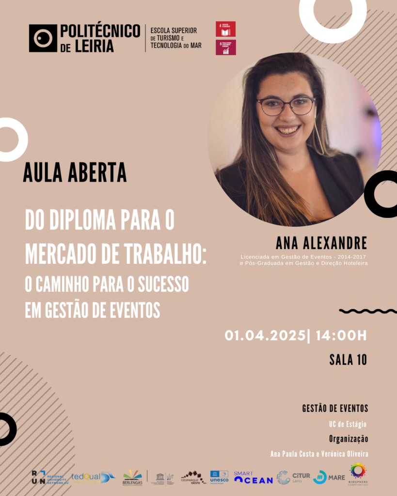 No dia 1 de abril de 2025, às 14h00, a ESTM – Politécnico de Leiria recebe Ana Alexandre, licenciada em Gestão de Eventos e pós-graduada em Gestão e Direção Hoteleira, para uma aula aberta dedicada ao tema “Do Diploma para o Mercado de Trabalho: O Caminho para o Sucesso em Gestão de Eventos”.