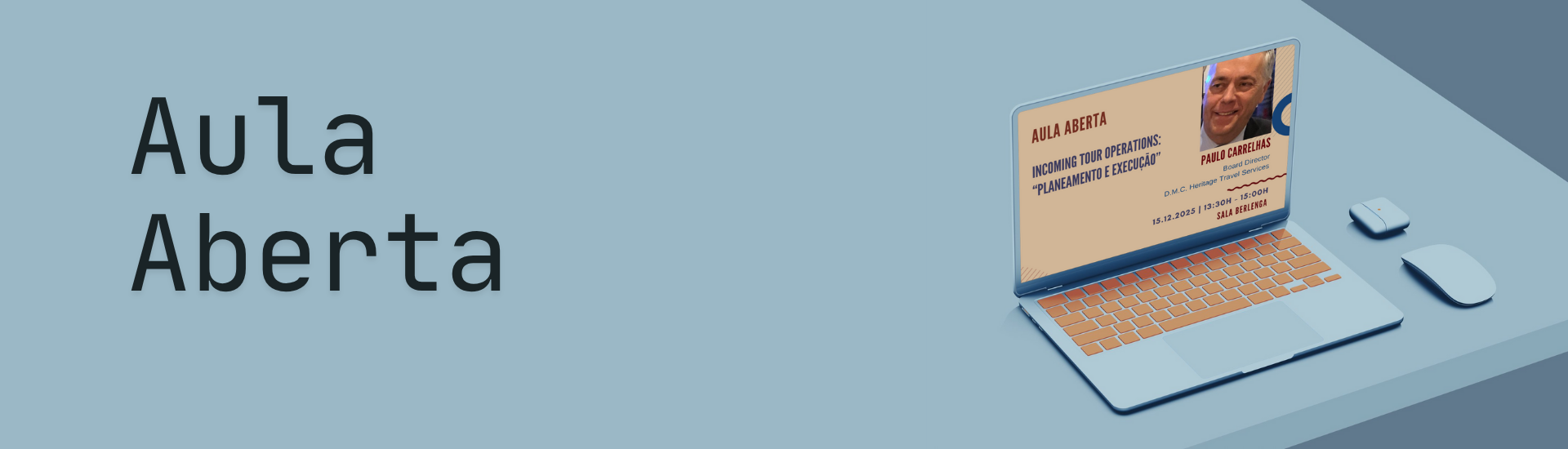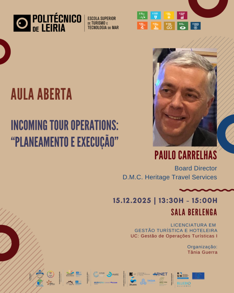 A Escola Superior de Turismo e Tecnologia do Mar recebe, no dia 15 de dezembro de 2025, entre as 13h30 e as 15h00, na Sala Berlenga, uma aula aberta dedicada ao tema “Incoming Tour Operations: Planeamento e Execução”.