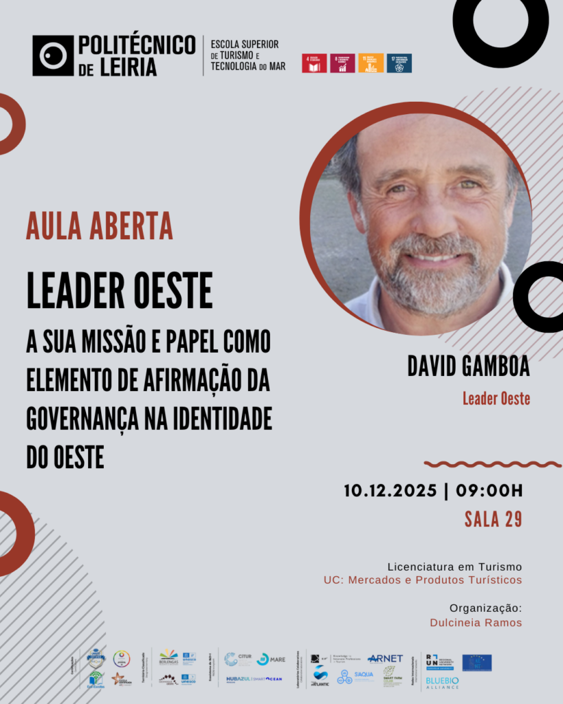 A Escola Superior de Turismo e Tecnologia do Mar irá acolher, no dia 10 de dezembro, uma aula aberta com David Gamboa, representante da Leader Oeste. A sessão dirige-se aos estudantes da Licenciatura em Turismo, no âmbito da unidade curricular Mercados e Produtos Turísticos.