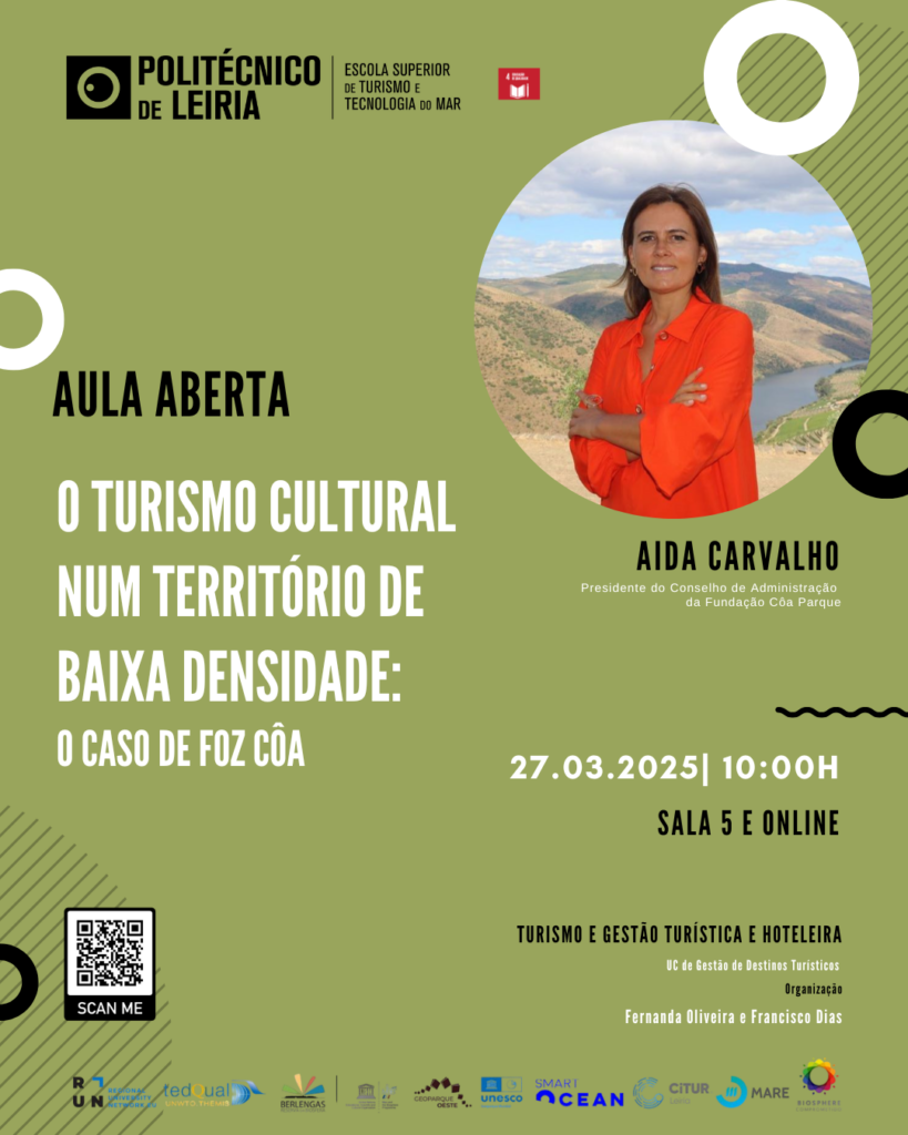 No dia 27 de março de 2025, às 10h00, a ESTM – Politécnico de Leiria recebe a Aida Carvalho, Presidente do Conselho de Administração da Fundação Côa Parque, para uma aula aberta sobre “O Turismo Cultural num Território de Baixa Densidade: O Caso de Foz Côa”.