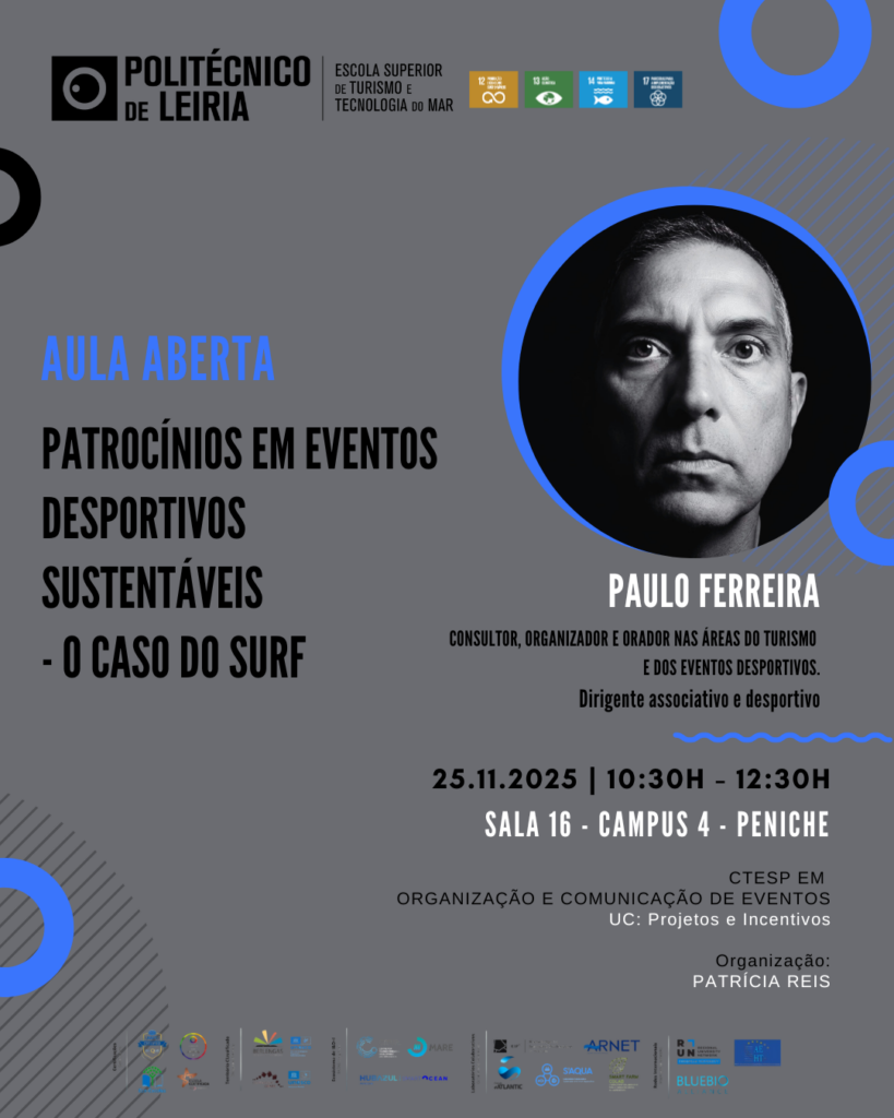 A Escola Superior de Turismo e Tecnologia do Mar recebe, no dia 25 de novembro, entre as 10h30 e as 12h30, a aula aberta “Patrocínios em eventos desportivos sustentáveis – O caso do surf”. A sessão decorre na Sala 16 – Campus 4, Peniche e será apresentada por Paulo Ferreira, consultor e organizador com experiência nas áreas do turismo, dos eventos desportivos e do associativismo.
