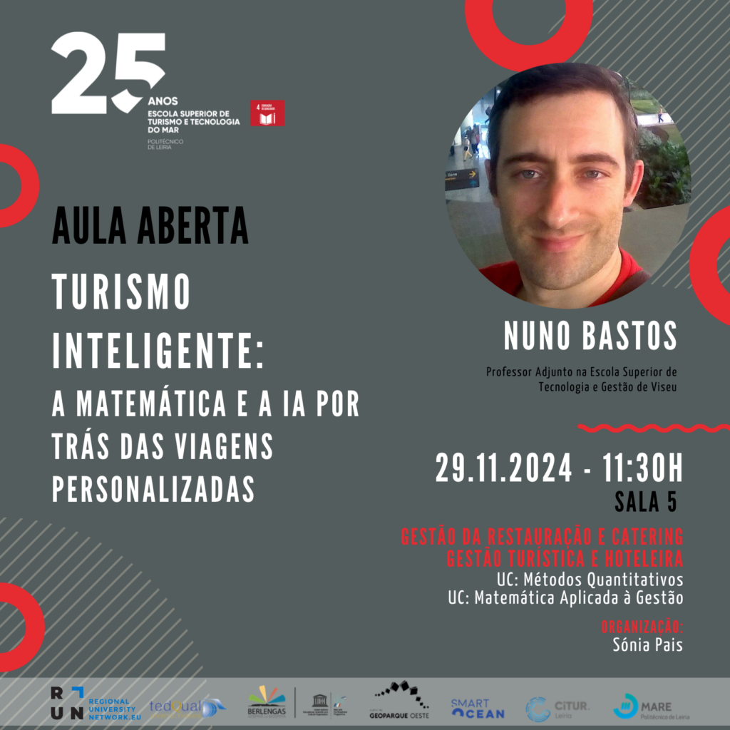 No dia 29 de novembro tem lugar uma Aula Aberta com Nuno Bastos, Professor Adjunto na Escola Superior de Tecnologia e Gestão de Viseu, subordinada ao tema Turismo Inteligente: A Matemática e a IA por trás das viagens personalizadas.