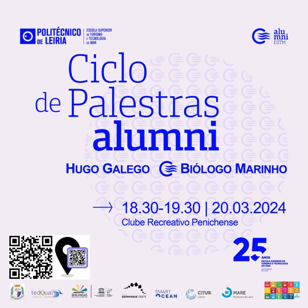 O quinto convidado é Hugo Galego, Biólogo Marinho, que irá partilhar o seu percurso profissional, no Clube Recreativo Penichense, das 18h30 às 19h30, no dia 20 de março de 2024.