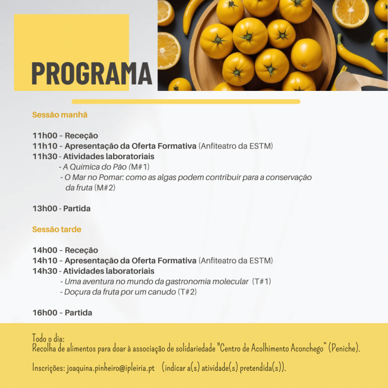 Para participar nas atividades laboratoriais, é necessário efetuar a inscrição através do e-mail joaquina.pinheiro@ipleiria.pt, indicando a(s) atividade(s) pretendida(s).
