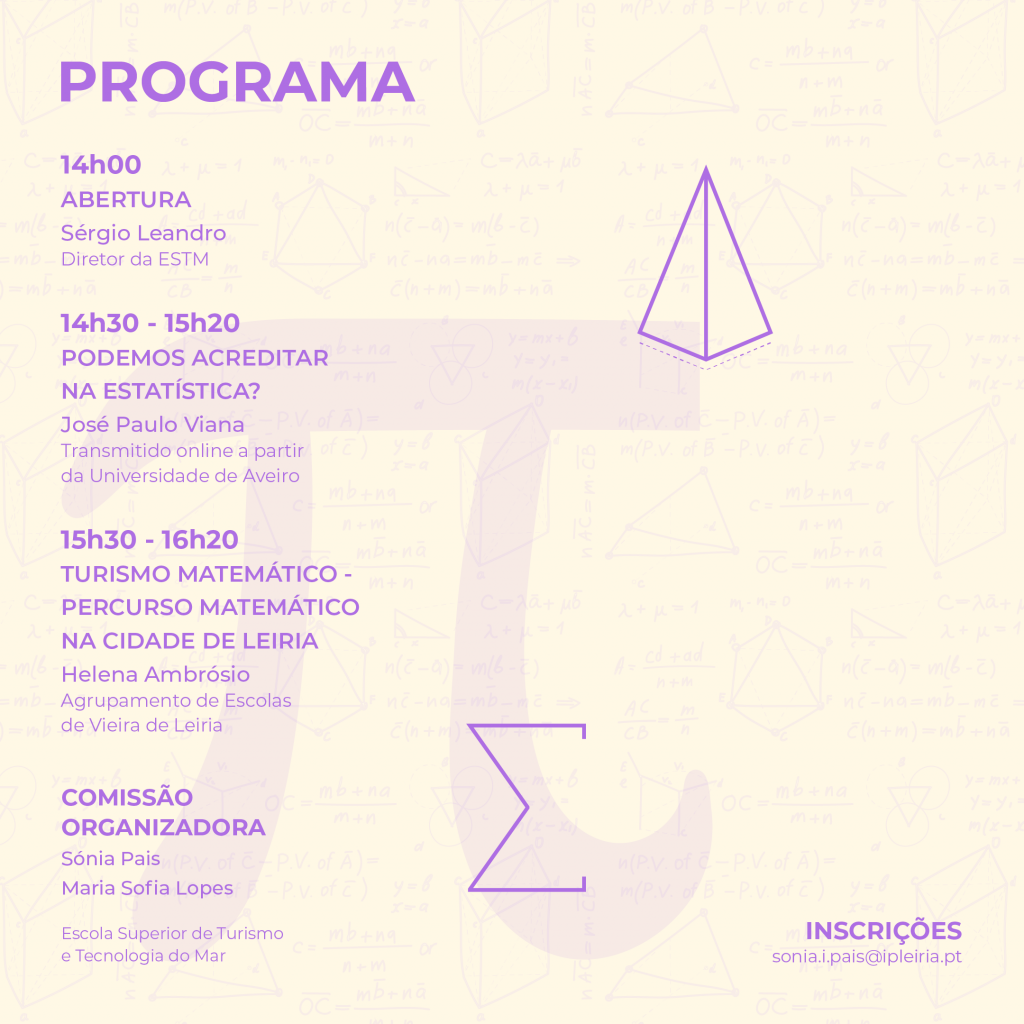 As inscrições para este evento estão abertas, bastando enviar um email para sonia.i.pais@ipleiria.pt e garantir o seu lugar nesta celebração do conhecimento matemático.