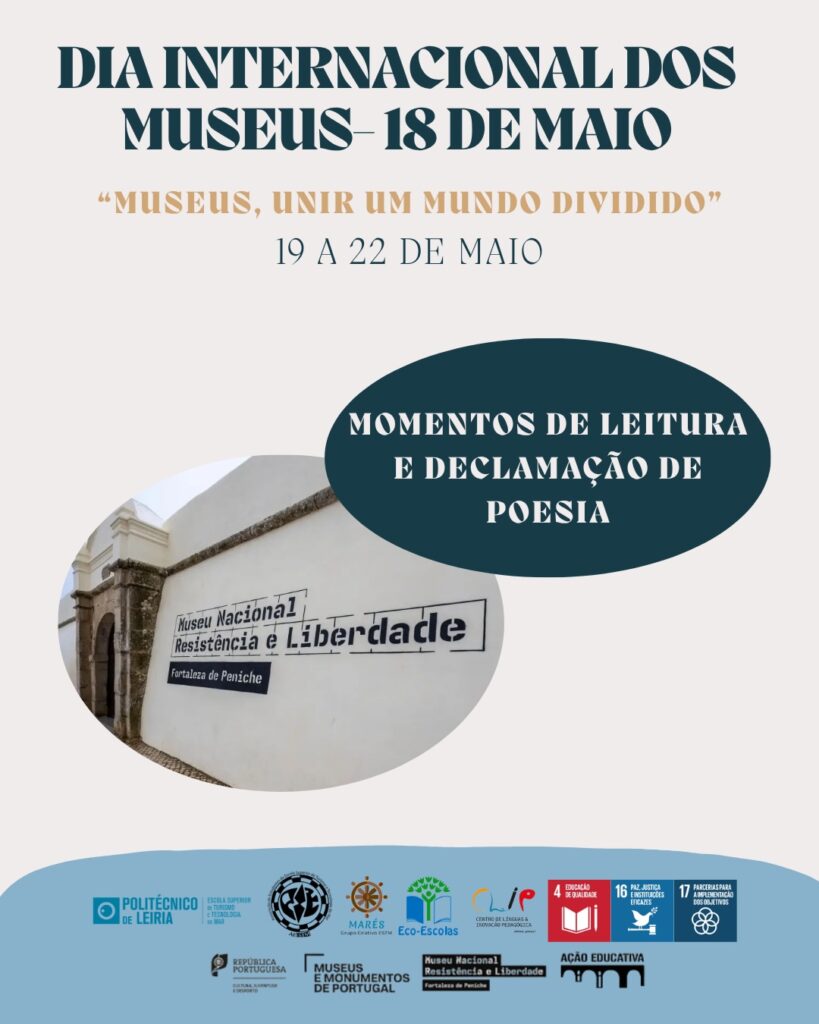 De 19 a 22 de maio de 2026, o Museu Nacional da Resistência e Liberdade, em Peniche, acolhe momentos de leitura e declamação de poesia protagonizados por estudantes de diversas nacionalidades. Esta iniciativa integra a celebração do Dia Internacional dos Museus, assinalado a 18 de maio, e pretende dar voz a poemas que promovam valores universais como Liberdade, Democracia, Justiça Social, Paz e Direitos Humanos.