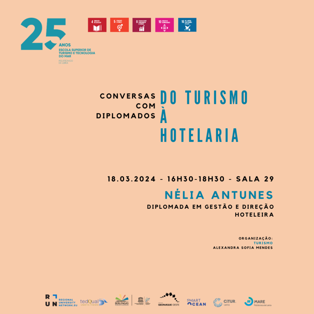 No âmbito da licenciatura em Turismo, decorre no próximo dia 18 de março, das 16:30 horas às 18:30 horas, na Sala 29, uma sessão do ciclo de “Conversas com Diplomados” – Do Turismo à Hotelaria”, com Nélia Antunes, diplomada em Gestão e Direção Hoteleira.