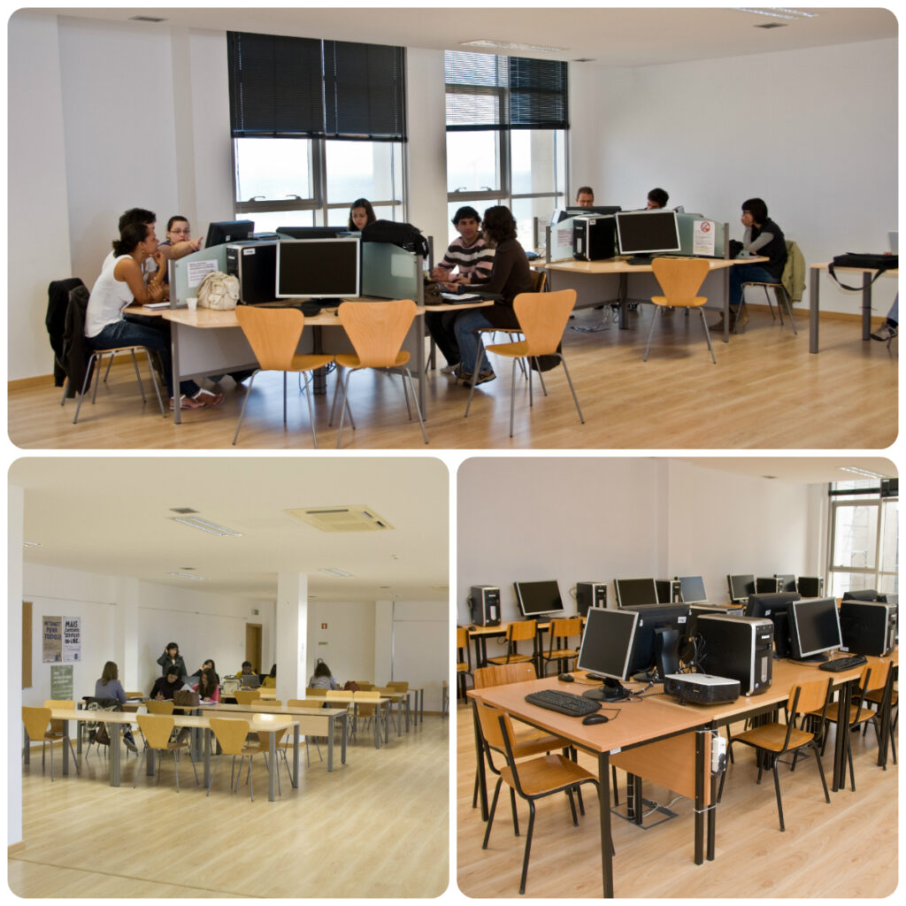 Sala de estudo, zona wireless, sala de utilizadores de informática.