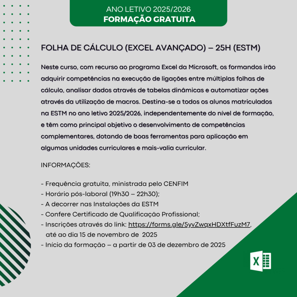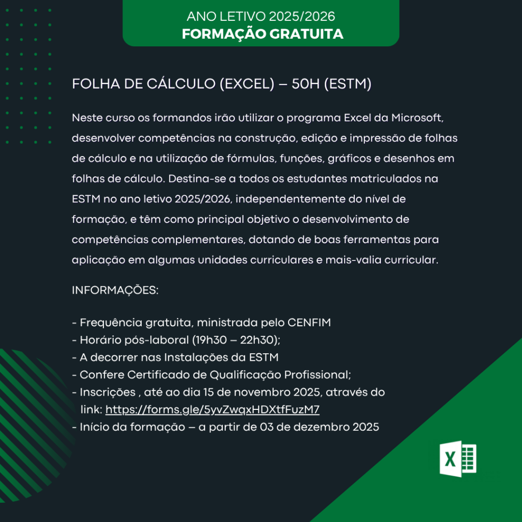 Aos estudantes da ESTM serão disponibilizados dois cursos gratuitos, em horário pós-laboral, nomeadamente: Folha de Cálculo (Excel) – 50h e Folha de Cálculo (Excel Avançado) – 25h.