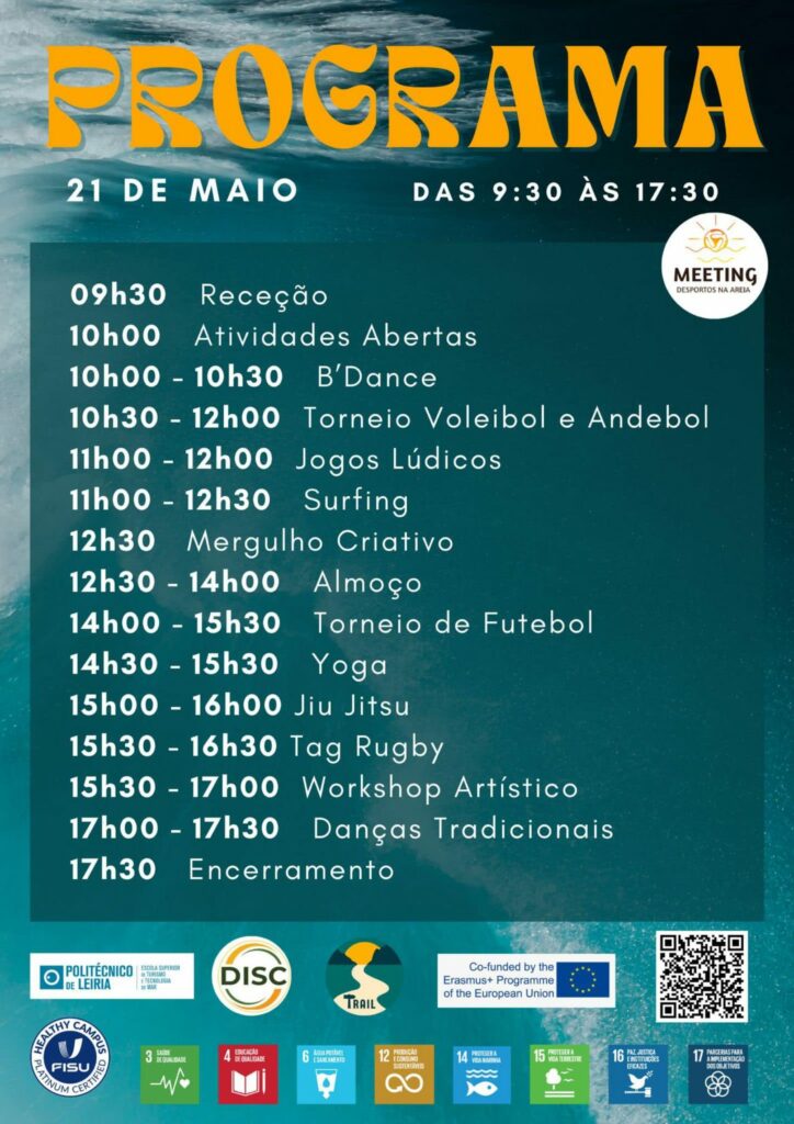 No âmbito da licenciatura do curso de Gestão de Eventos, a turma do 2º ano irá realizar a 3ª edição do Meeting Desportos na Areia, no dia 21 de Maio (terça-feira), das 9h30 às 17h30, na Praia do Molhe Leste, Peniche.