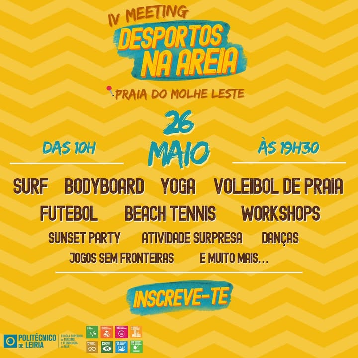No próximo dia 26 de maio, entre as 10h00 e as 19h30, terá lugar na Praia do Molhe Leste, em Peniche, o IV Meeting Desportos na Areia, uma iniciativa organizada pela turma do 2.º ano da Licenciatura em Gestão de Eventos da Escola Superior de Turismo e Tecnologia do Mar do Politécnico de Leiria, com a coordenação dos nosso docentes, Carlos Rebelo e Natália Perez.