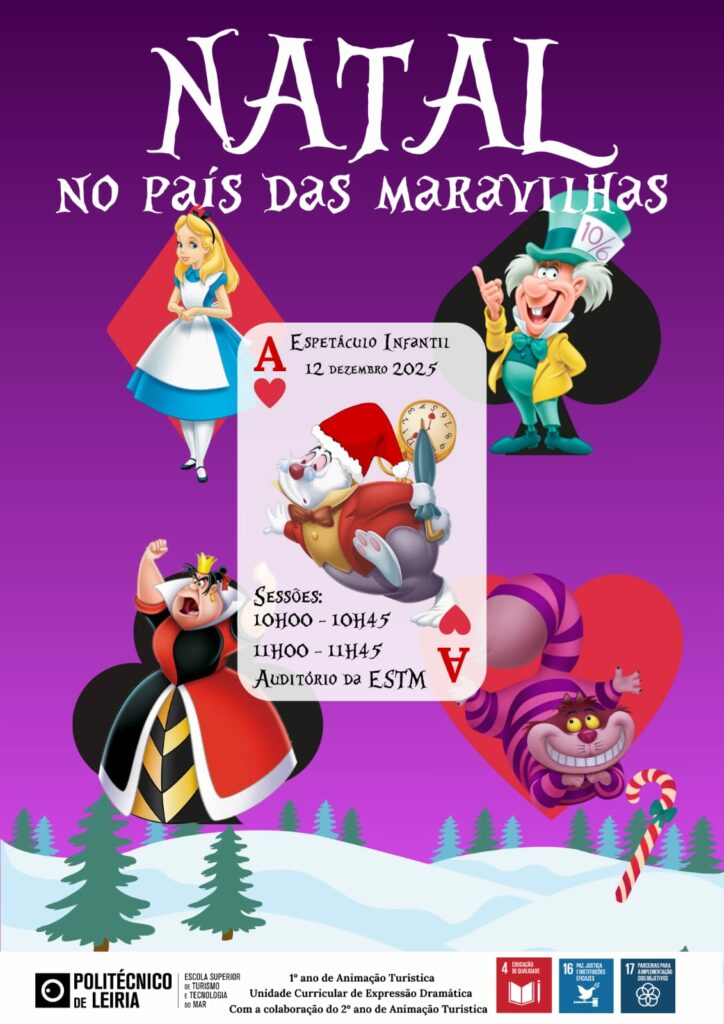 O espírito natalício chega à ESTM com a magia do universo de Alice no País das Maravilhas, num espetáculo infantil dinamizado pelo 1.º ano do curso de Animação Turística e colaboração do 2º ano, sob a coordenação da docente Daniela Amorim. A poucos dias do Natal, esta apresentação promete proporcionar aos mais pequenos uma viagem marcada pela fantasia, pela cor e pela imaginação, num ambiente onde tudo pode acontecer.