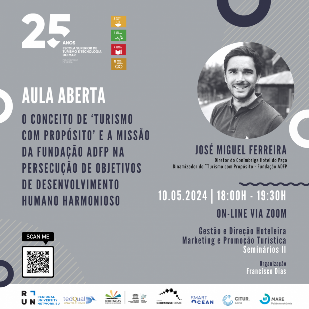 No dia 10 de maio, tem lugar on-line via zoom, uma Aula Aberta com José Miguel Ferreira, Diretor do Conímbriga Hotel do Paço | Dinamizador do ‘Turismo com Propósito’ – Fundação ADFP, com o tema “O conceito de ‘Turismo com Propósito’ e a missão da Fundação ADFP na persecução de objetivos de desenvolvimento humano harmonioso”.