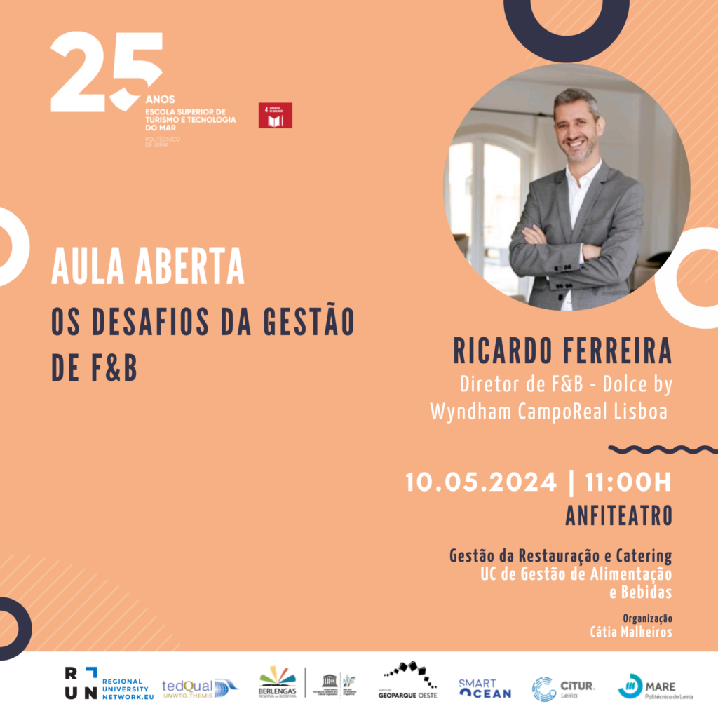 No dia 10 de maio, tem lugar uma Aula Aberta no Anfiteatro da ESTM, com Ricardo Ferreira, Diretor de F&B do Dolce by Wyndham – CampoReal Lisboa, subordinada ao tema “Os desafios da Gestão de F&B”.