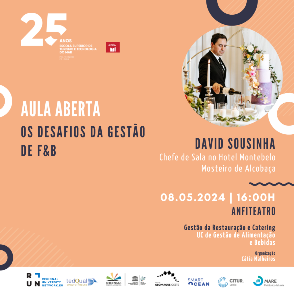 No dia 08 de maio, tem lugar uma Aula Aberta no Anfiteatro da ESTM, com David Sousinha, Chefe de Sala no Hotel Montebelo – Mosteiro de Alcobaça, subordinada ao tema “Os desafios da Gestão de F&B”.