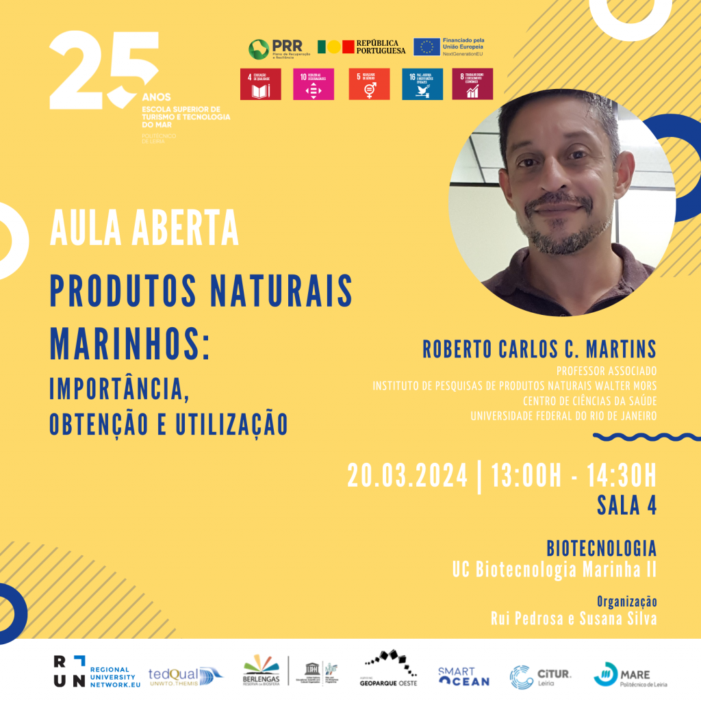 No dia 20 de março, tem lugar uma aula aberta com Roberto Carlos C. Martins, Professor Associado – Instituto de Pesquisas de Produtos Naturais Walter Mors, Centro de Ciências da Saúde, Universidade Federal do Rio de Janeiro, com o tema “Produtos Naturais Marinhos: importância, obtenção e utilização”.