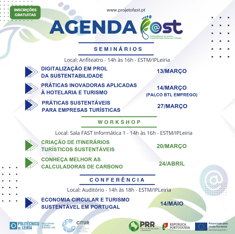 Entre os meses de março, abril e maio, a Escola Superior de Turismo e Tecnologia do Mar do Politécnico de Leiria, em Peniche, recebe um conjunto de Seminários, Workshops e uma Conferência no âmbito do Projeto FAST. As atividades centram-se em temas estratégicos para a sustentabilidade no turismo e têm participação gratuita.