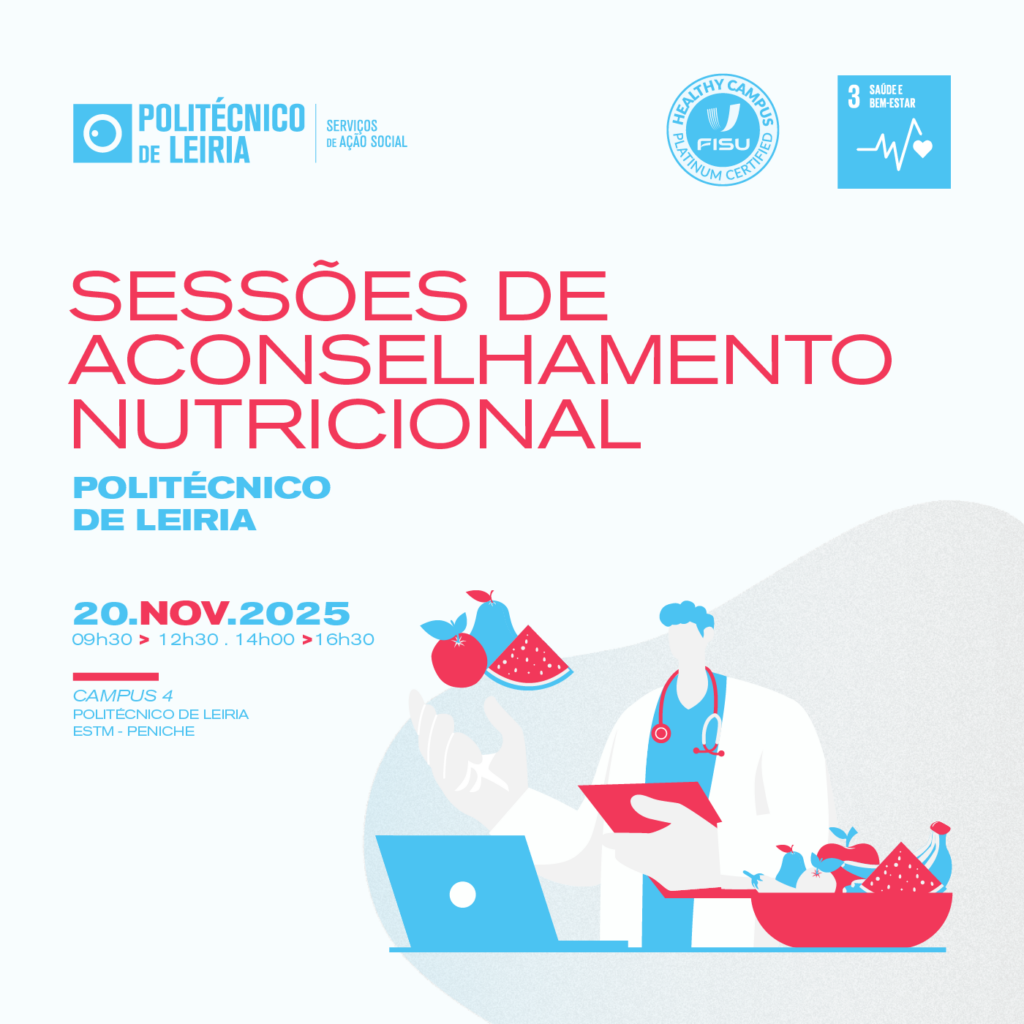 No dia 20 de novembro de 2025, os Serviços de Ação Social do Politécnico de Leiria disponibilizam sessões de aconselhamento nutricional no Campus 4, na Escola Superior de Turismo e Tecnologia do Mar, em Peniche. Cada sessão terá a duração de 30 minutos.