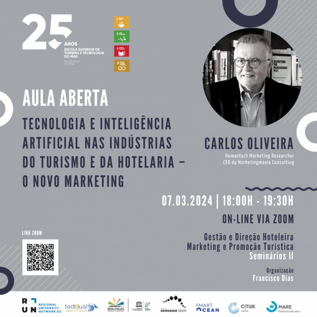 Amanhã, dia 07 de março, tem lugar uma Aula Aberta com Carlos Manuel de Oliveira, da Humantech Marketing Researcher e CEO da Marketingmania Consulting, com o tema “Tecnologia e Inteligência Artificial nas Indústrias do Turismo e da Hotelaria – O Novo Marketing”.