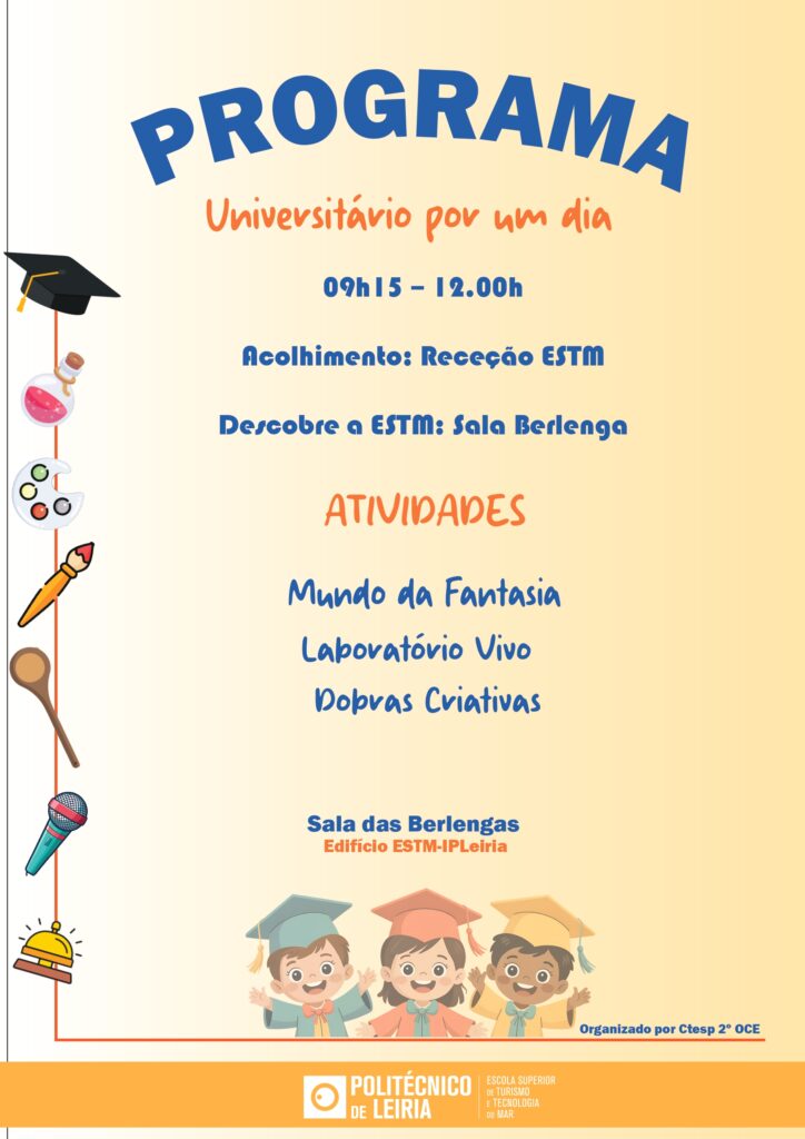 A Escola Superior de Turismo e Tecnologia do Mar recebe, no dia 12 de dezembro, mais uma edição da iniciativa “Universitário por um dia”, dinamizada pelos estudantes do 2.º ano do curso de Organização e Comunicação de Eventos, sob a coordenação das docentes Patrícia Reis, Mara Moreira e Rita Pimenta. A atividade dirige-se aos alunos do 4.º ano da Escola Básica Velha, do Agrupamento de Escolas D. Luís de Ataíde, proporcionando-lhes uma manhã de descoberta do ambiente académico.