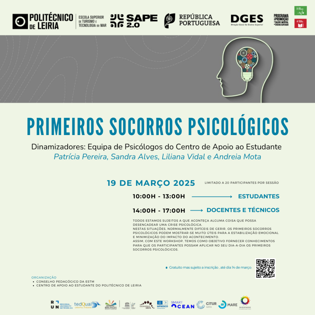 No dia 19 de março de 2025, o Conselho Pedagógico da ESTM, em parceria com o Centro de Apoio ao Estudante do Politécnico de Leiria, promove um workshop de Primeiros Socorros Psicológicos, com o objetivo de capacitar os participantes com ferramentas fundamentais para a estabilização emocional e a minimização do impacto de acontecimentos difíceis.